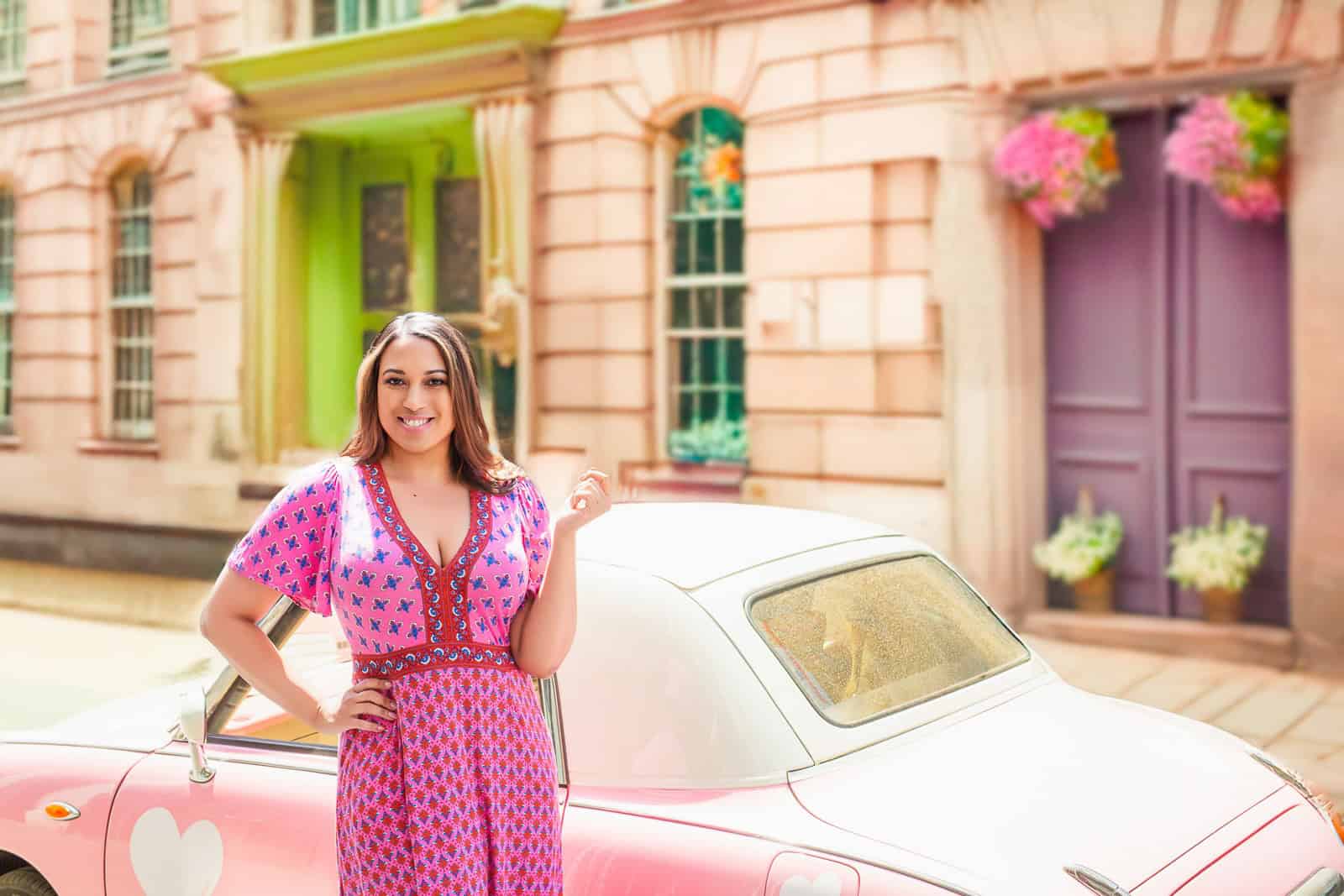 Natasha did a vibrant pink dress and cute matching sneakers. For variety, she brought a trench coat, heels, and we added oversized sunglasses. You’ll see how these led to distinct vibes that don’t feel like they were shot on the same day, let along 10 minutes after each other.